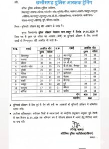 उपरोक्त तिथनुसार अधीनस्थ जिलों के नव आरक्षकों को जॉइनिंग इंस्ट्रक्शन के अनुसार पूर्ण तैयारी के साथ दिनांक 11 जनवरी 2026 तक अनिवार्य रूप से प्रशिक्षण संस्थान में आमद हेतु निर्देशित किया गया है।