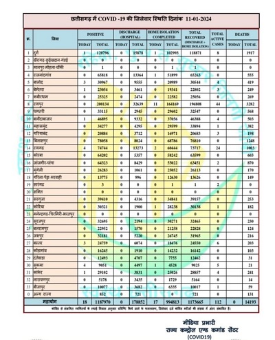 छत्तीसगढ़ में अभी कोरोना के 112 एक्टिव मरीज हैं। सबसे अधिक मरीज रायपुर में मिले हैं। यहां 44 मरीजों का इलाज चल रहा है। स्वास्थ्य विभाग की ओर से गुरुवार को जारी रिपोर्ट के अनुसार 18 नए मरीज मिले हैं। सबसे अधिक चार-चार मरीज सुकमा व रायगढ़ में मिले हैं। बस्तर व बालोद में 3-3, दुर्ग, बेमेतरा, कांकेर और बलौदाबाजार में एक-एक संक्रमित मिला है।