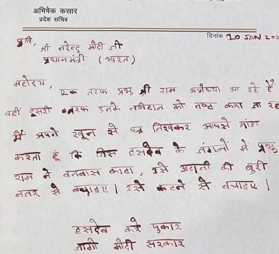 खून से लिखे पत्र में अभिषेक ने कहा कि “एक तरफ प्रभु श्री राम अयोध्या आ रहे हैं, वहीं दूसरी तरफ उनके ननिहाल को नष्ट किया जा रहा है। मैं अपने खून से पत्र लिखकर आपसे मांग करता हूं ,कि जिस हसदेव के जंगलों में प्रभु राम ने वनवास काटा, उसे अडानी की बुरी नजर से बचाइए। उसे कटने से बचाइए। हसदेव करें पुकार, जागो मोदी सरकार।”