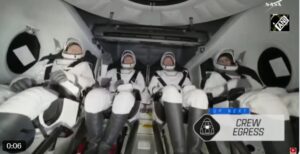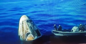 यहां रिकवरी कर्मी ड्रैगन को रिकवरी पोत मेगन पर चढ़ाने के लिए प्रक्रियाओं से गुज़र रहे हैं, टीमें यान को रिकवरी जहाज़ पर चढ़ाएँगी और अंतरिक्ष यान का हैच खोलेंगी।