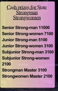 और सीनियर स्ट्रांग पुरुष एवं महिला स्टेट खिलाड़ी का नगद पुरस्कार इस प्रकार था।