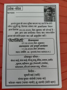 कृपया इसे ही शोक पत्र समझे। सह परिवार आत्मा की शांतिहतु शांति भोज में आने की कृपा करें। संजय साहू