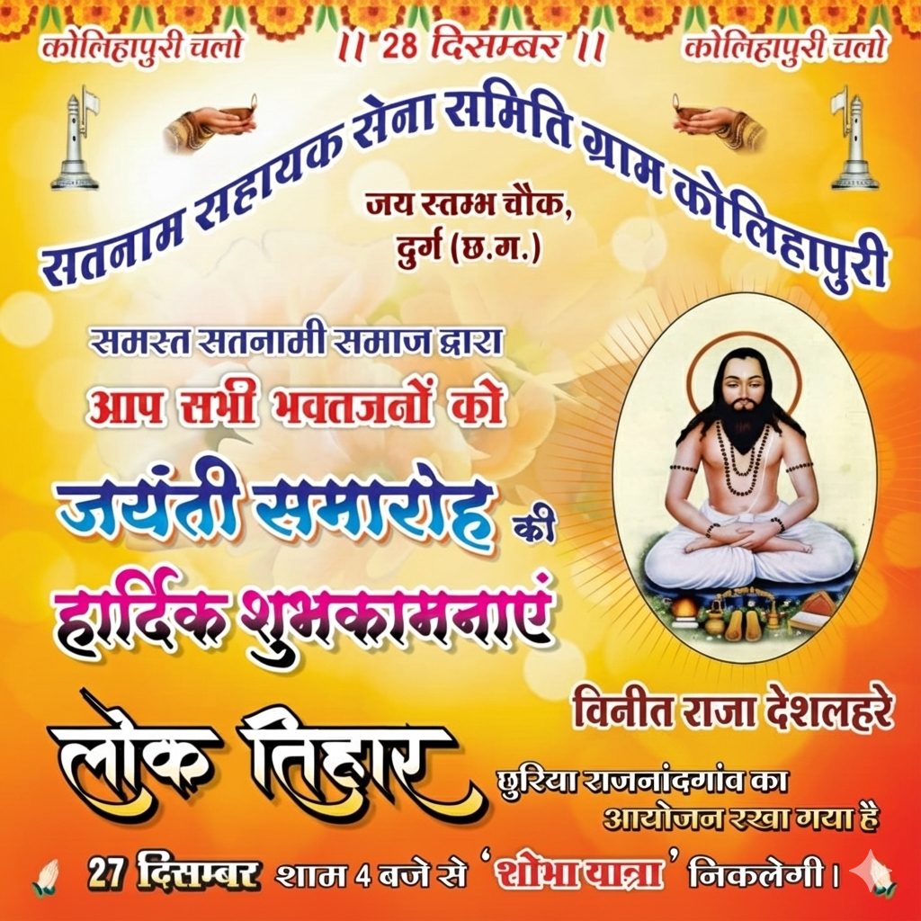 कार्यक्रम का मुख्य जयंती समारोह 28 दिसंबर को आयोजित किया जाएगा। समस्त सतनामी समाज द्वारा इस अवसर पर सभी भक्तजनों को ‘जयंती समारोह’ की हार्दिक शुभकामनाएं दी गई हैं। पोस्टर के माध्यम से ‘कोलिहापुरी चलो’ का आह्वान किया गया है, ताकि अधिक से अधिक लोग इस पावन अवसर का हिस्सा बन सकें।