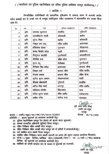 रायपुर पुलिस महकमे में बड़ी सर्जरी: नए साल से पहले 59 पुलिस अधिकारियों के तबादले, SSP ने जारी किया आदेश।