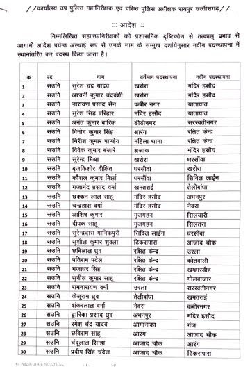 निरीक्षकों के साथ-साथ एसएसपी ने मंगलवार रात 18 सब-इंस्पेक्टरों की तबादला सूची भी जारी की। इन अधिकारियों को खरोरा, माना, कोतवाली, डीडी नगर, सरस्वती नगर, मुजगहन, पुरानी बस्ती, पंडरी, धरसींवा और राजेंद्र नगर जैसे थानों में नई नियुक्तियां दी गई हैं।