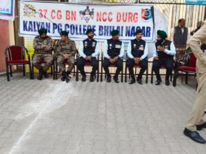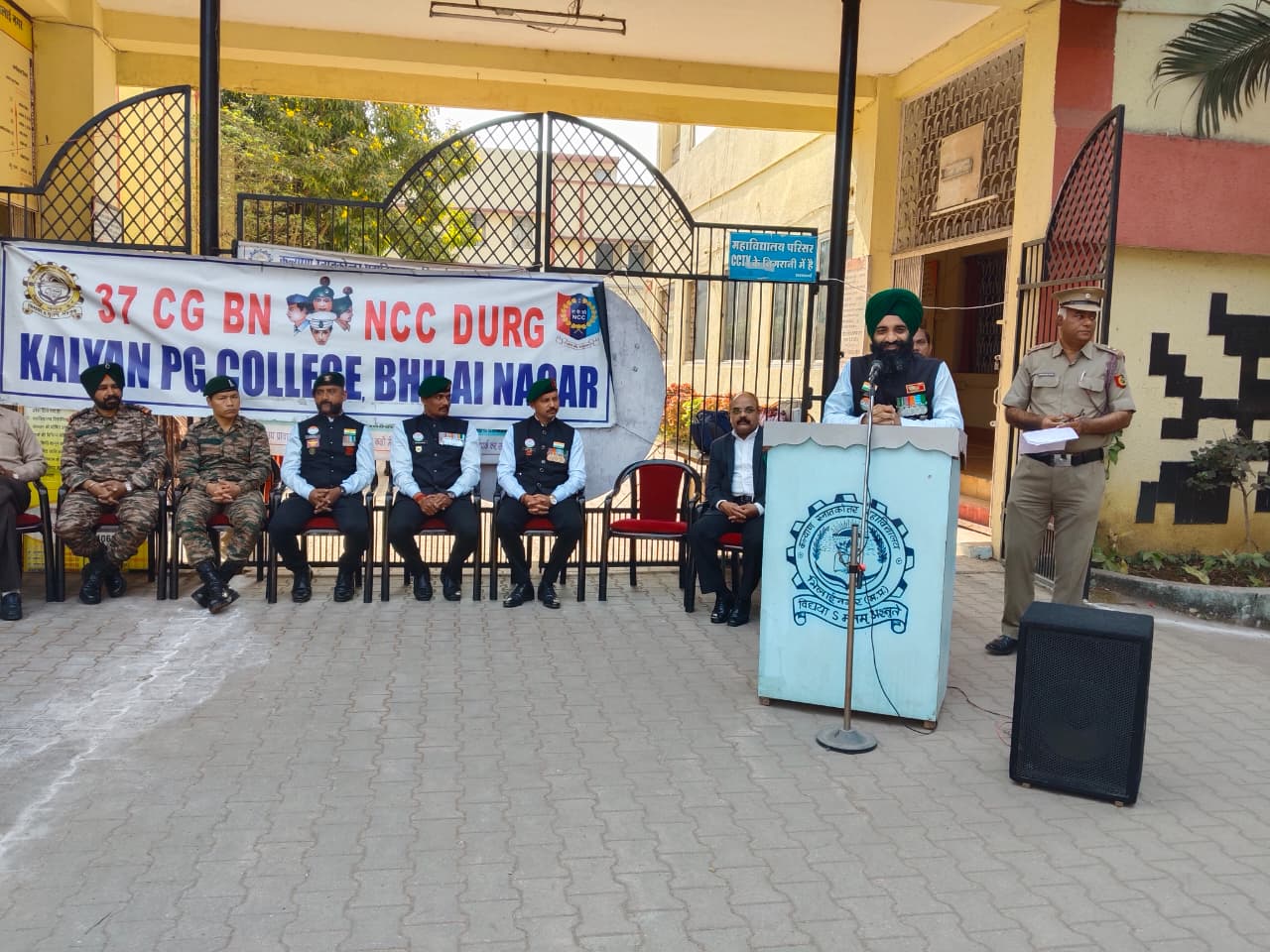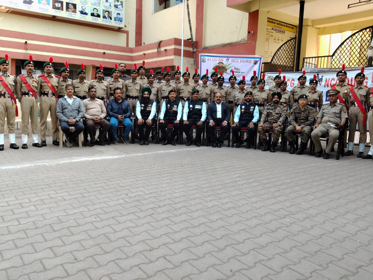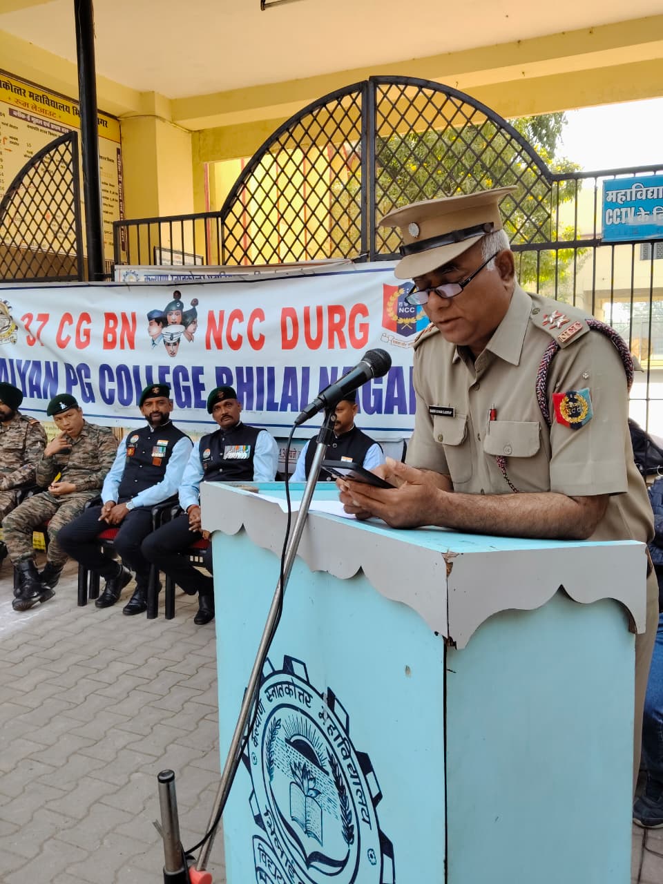 इस अवसर पर छत्तीसगढ़ आर्मी पब्लिक फाउंडेशन के अध्यक्ष हरप्रीत सिंह ने प्राध्यापकों और कैडेटों का उत्साह वर्धन करते हुए कहा कि फौजी के शौर्य, वीरता सहित उनका सम्मान करने का मौका आपसे मिला है, और एनसीसी के कैडेट हमेशा कंधे से कंधे मिलाकर हमें सहयोग प्रदान करते रहते हैं भारत देश की रीढ़ की हड्डी यदि कहा जाए तो हमारा डिफेंस है जो आज भी विश्व में सबसे मजबूत है। विशिष्ट अतिथि गिरजेश सिंह ने अपने उद्बोधन में बताया कि समाज में आ रहे भटकाव को रोकने के उद्देश्य से इस फाउंडेशन की स्थापना की और युवाओं को ट्रेनिंग देते हैं, उनका उत्साह बढ़ाते हैं और हौसला मजबूत करते हैं तथा उनका मनोबल ना गिरे और अपने लक्ष्य के लिए ऐसे खड़े हो जाएं कि वह सफलता को प्राप्त करें। उन्होंने बताया कि हमारी सेना प्रतिदिन एक ऑपरेशन लॉन्च करती है और उसे अंजाम तक पहुंचती है। आज कैडेट भी भारतीय सेना का हिस्सा बनकर देश सेवा कर सकते हैं। उद्बोधन के अगले क्रम में विशिष्ट अतिथि रजनीश कुमार सिंह ने युवा पीढ़ी को संदेश दिया कि यदि आप अनुशासित हैं व माता-पिता तथा गुरु का सम्मान करते हैं तो आप कभी निराश नहीं होंगे चाहे आप किसी भी प्रकार की सेवा या व्यवसाय से जुड़े हो आप देश की सेवा कर रहे होंगे और आपकी सफलता निश्चित है। उद्बोधन की अंतिम कड़ी में विशिष्ट अतिथि चंद्र मोहन ने कहा कि ब्लैक कैट कमांडो सुनकर डरे नहीं वह भी आपकी तरह ही सामान्य व्यक्ति हैं, वह सेना से ही चयन होकर एक विशेष प्रशिक्षण प्राप्त करते हैं और एनएसजी के अंतर्गत कार्य करते हुए भारत देश में किसी भी विषम स्थिति में 30 मिनट में पहुंच कर भारत की रक्षा को बनाए रखते हैं।