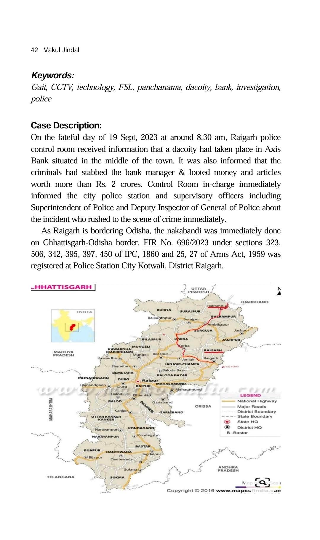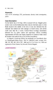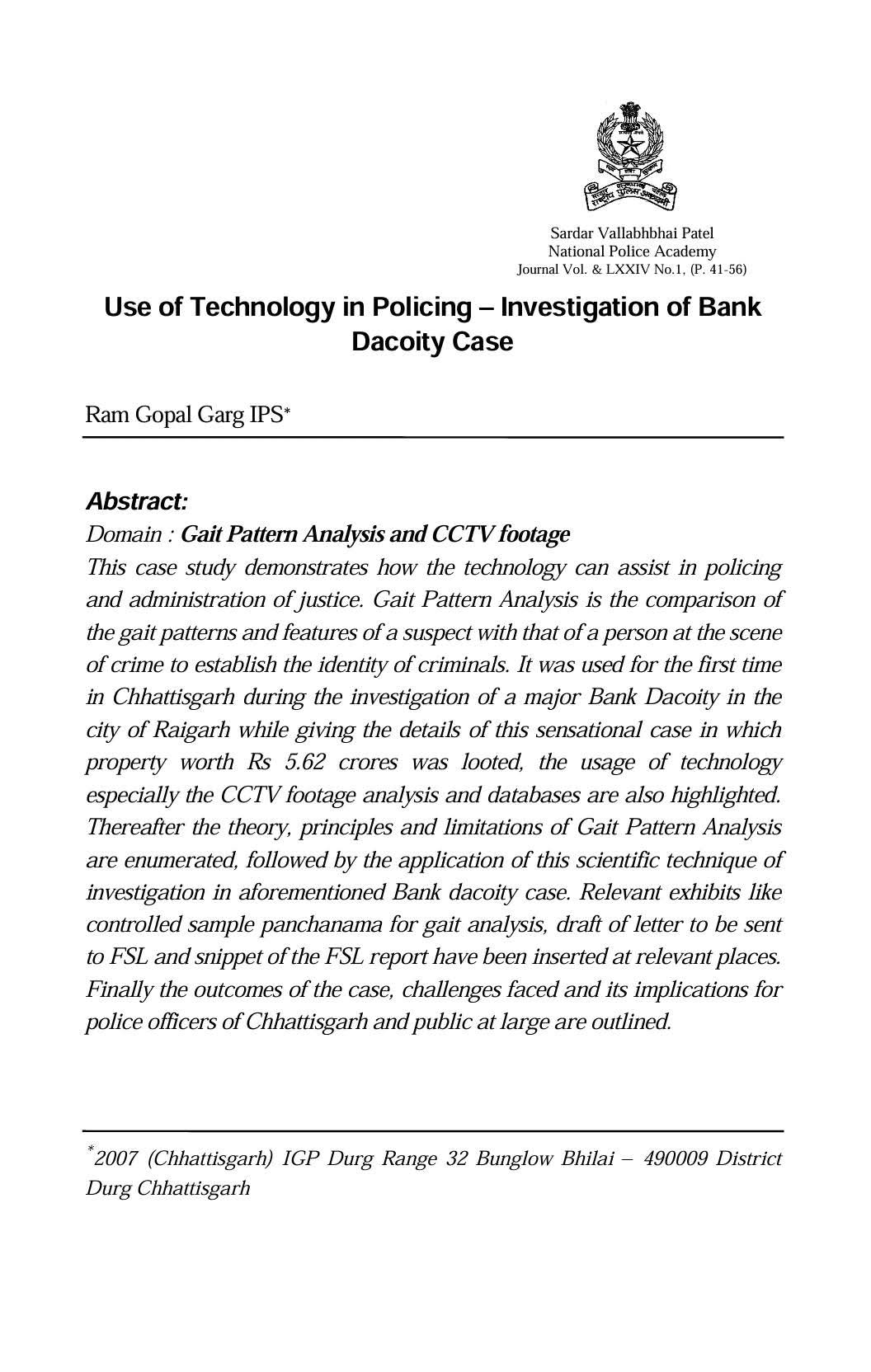 इस शोध लेख में श्री गर्ग द्वारा रायगढ़ शहर में हुई एक बड़ी बैंक डकैती की विवेचना के दौरान Gait Pattern Analysis और CCTV Footage Analysis जैसी अत्याधुनिक तकनीकों के प्रयोग को विस्तार से बताया गया है। यह पहली बार था जब छत्तीसगढ़ में अपराधियों की पहचान स्थापित करने के लिए Gait Pattern Analysis तकनीक का उपयोग किया गया। इस तकनीक के माध्यम से आरोपियों की चाल (gait) के विश्लेषण को वैज्ञानिक प्रमाण के रूप में प्रयोग किया गया, जिससे अपराध की तह तक पहुँचने और अपराधियों की उपस्थिति सिद्ध करने में सफलता मिली।