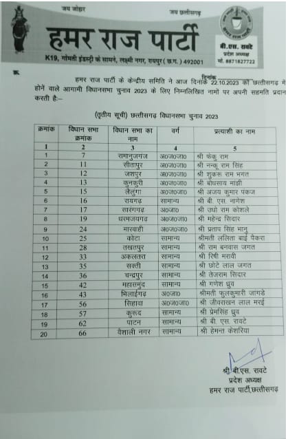 अरविंद नेताम की पार्टी हमर राज पार्टी ने छत्तीसगढ़ प्रदेश विधानसभा चुनाव 2023 के लिए 20 प्रत्याशियों की घोषणा State October 24, 2023 1 minute read रिपोर्टर वीरेन्द्र चौधरी की रिपोर्ट भिलाई दुर्ग से,