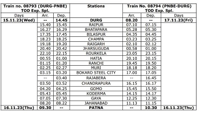 इसी प्रकार यह ट्रेन 08794 नंबर के साथ 16/11/2023 (गुरुवार) को प्रातः 10.30 बजे पटना स्टेशन से दुर्ग के लिए प्रस्थान करेगी। यह ट्रेन जहानाबाद, गया, कोडरमा, गोमो, चंद्रपुरा, बोकारो, मुरी, रांची, हटिया, राउरकेला स्टेशन होते हुए झारसुगुड़ा आगमन 00.58 बजे एवं प्रस्थान 00.10 बजे (17/11/2023), रायगढ़ आगमन 02.10 बजे एवं प्रस्थान 02.12 बजे, चाम्पा आगमन 03.23 बजे एवं प्रस्थान 03.25 बजे, बिलासपुर आगमन 04.35 बजे एवं प्रस्थान 04.45 बजे भाटापारा आगमन 5.28 बजे एवं प्रस्थान 5:30 बजे रायपुर आगमन 7:10 एवं प्रस्थान 7:15 एवं दिनांक 17. 11. 2023 शुक्रवार को दुर्ग स्टेशन पहुंचेगी इस गाड़ी में कुल 22 कोच उपलब्ध रहेंगे।