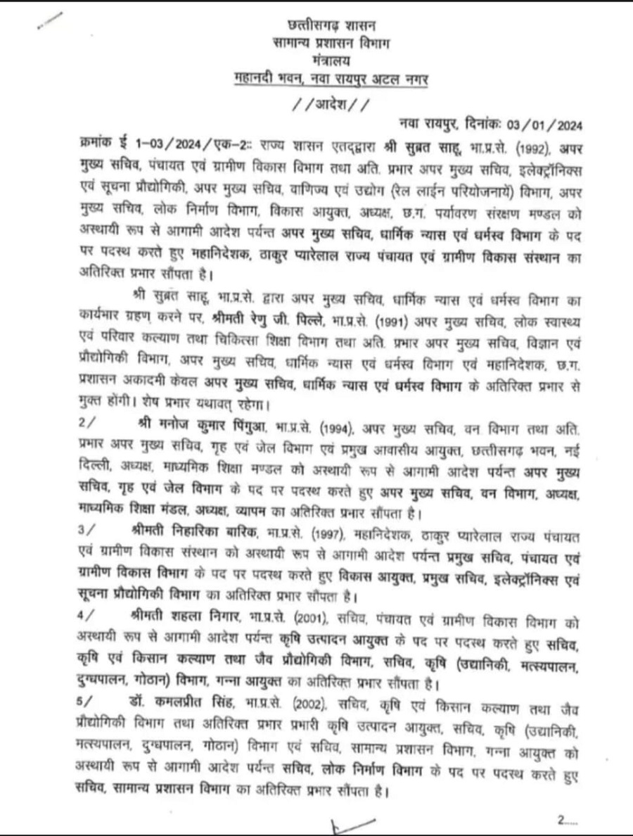 रायपुर जिला कलेक्टर, जिला पंचायत सीईओ, नगर पालिक निगम आयुक्त बदले गए, नए अफसरों की हुई नियुक्ति