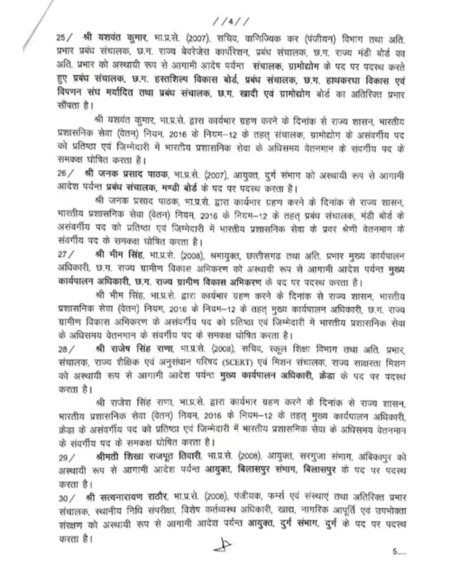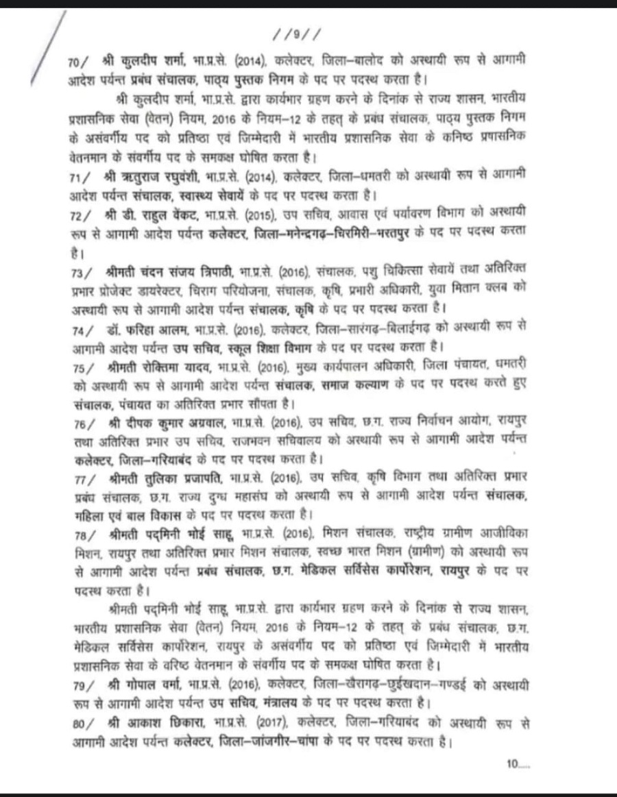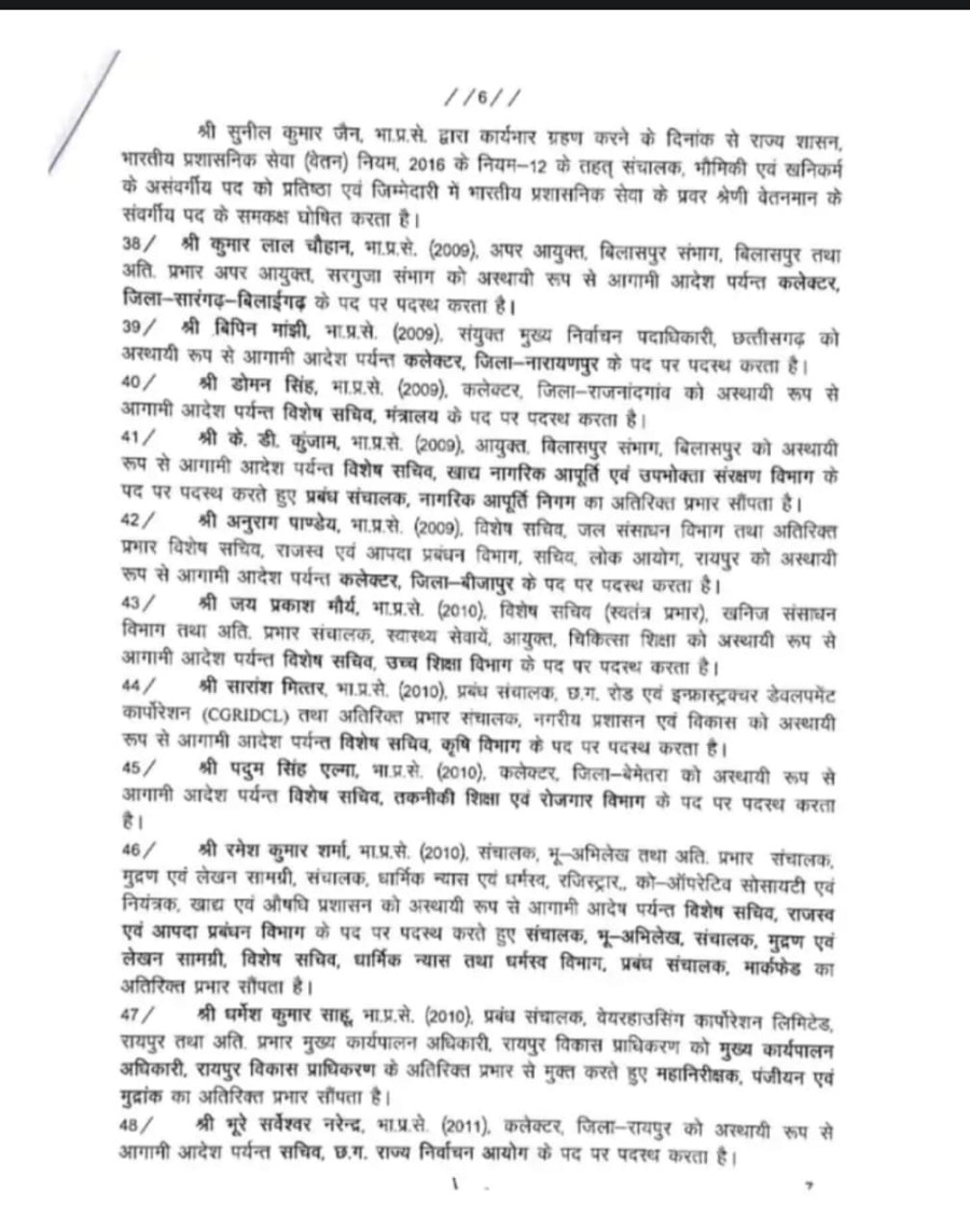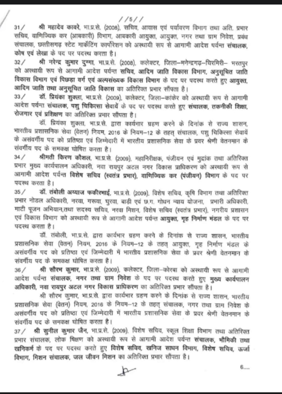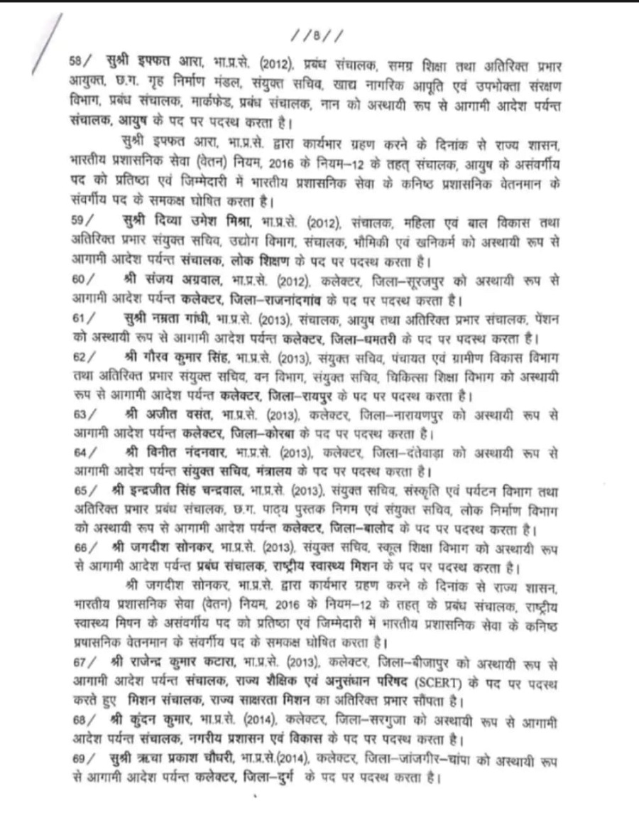 गौरव सिंह को रायपुर जिला कलेक्टर, रायपुर नगर निगम में सीइओ अविनाश मिश्रा होंगे जबकि रायपुर ज़िला पंचायत के सीईओ विश्वदीप नियुक्त किए गए हैं।