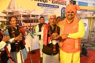 दुर्ग 22 जनवरी 2024/ अयोध्या में श्री रामलला के प्राण प्रतिष्ठा के अवसर पर पूरा दुर्ग नगर भक्ति के रंग में रंग गया है। इस शुभ अवसर पर जिला प्रशासन द्वारा कसारीडीह स्थित श्री रामजानकी मंदिर प्रांगण में श्री राम चरित मानस गायन का जिला स्तरीय आयोजन किया गया। विधायक दुर्ग शहर श्री गजेन्द्र यादव, संभागायुक्त श्री एस. एन. राठौर आईजी श्री बद्रीनारायण मीणा, कलेक्टर सुश्री ऋचा प्रकाश चौधरी और एसएसपी श्री आर. जी. गर्ग सहित अन्य अधिकारी और नगरवासी मानस गायन का श्रवण किये। आयोजन में आनंद धारा मानस मंडली मालूद, सांई मानस परिवार अण्डा, उपासना मानस मंडली करेला, रघुनाथ मानस मंडली परसाही और जय मानस मंडली दारगांव धमधा नें राम चरित मानस का सूमधुर भक्तिमय प्रस्तुती दिये। अधिकारियों नें मानस मंडलियों को प्रस्तुती उपरांत स-सम्मान विदाई दिये। विधायक श्री यादव एवं अधिकारियों नें श्री रामजानकी मंदिर में पूजा अर्चना कर आस्था के दिप प्रज्वलित किये। इस अवसर पर मंदिर परिसर में नगर वासियों नें 5100 दिप प्रज्वलित कर मंदिर को रोशनी से जगमग किये। विधायक श्री यादव नें अपने संक्षिप्त उद्बोधन में अयोध्या में श्री रामलला प्राण प्रतिष्ठा को सभी सनातनियों के लिए गौरवान्वित होने की बात कही। उन्होंने आज के दिन को एतिहासिक दिन निरूपित करते हुए, लोगों को श्री रामचन्द्र जी के व्यक्तित्व को आत्मसात कर जीवन को उज्वल बनाने का आह्वान किया। इस अवसर पर स्थानीय जनप्रतिनिधि, जिला प्रशासन के वरिष्ठ अधिकारियों और नगरवासी बड़ी संख्या में उपस्थित थे।