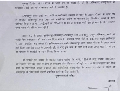 केंद्रीय उड्डयन मंत्री ज्योतिरादित्य सिंधिया ने लिखा हैं ‘अंबिकापुर हवाई अड्डे का स्वामित्व छत्तीसगढ़ सरकार के पास है। उड़ान योजना के पहले दौर के अंतर्गत अंबिकापुर हवाई अड्डे को आरसीए उड़ानों के प्रचलन हेतु विकसित करने के लिए चिन्हित किया गया था। हवाई अड्डे का 3C-VFR के रूप में विकास कार्य पूरा हो गया है और लाइसेंस प्राप्त करने की प्रक्रिया चल रही है।