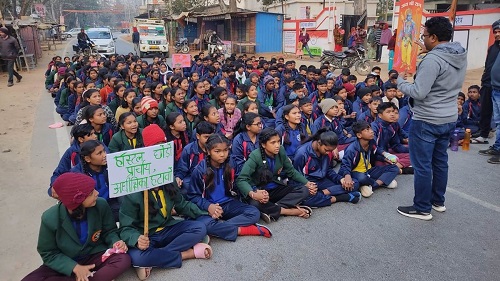 प्राचार्य व अधीक्षिका को हटाने की मांग को लेकर एकलव्य स्कूल के बच्चे सड़क पर बैठे धरने पर बच्चे सुबह छह बजे से
