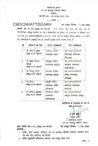 जारी आदेश के अनुसार, अभिनव कुमार को उप मंडलाधिकारी बिलासपुर भेजा गया है। वहीं अजय दिनक भोसले को उप मंडलाधिकारी कसडोल में नियुक्त किया गया है। इसके अलावा हिमांशु डांगरे को उप मंडलाधिकारी राजिम भेजा गया है। नीरज को उप मंडलाधिकारी मनेंद्रगढ़ तो निखिल अग्रवाल को जशपुर उप मंडलाधिकारी नियुक्त किया गया है।